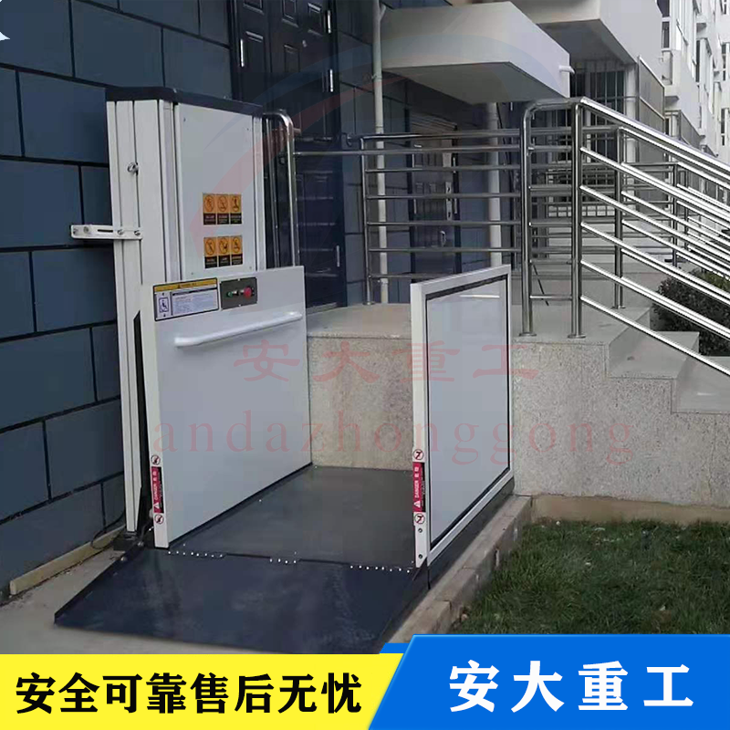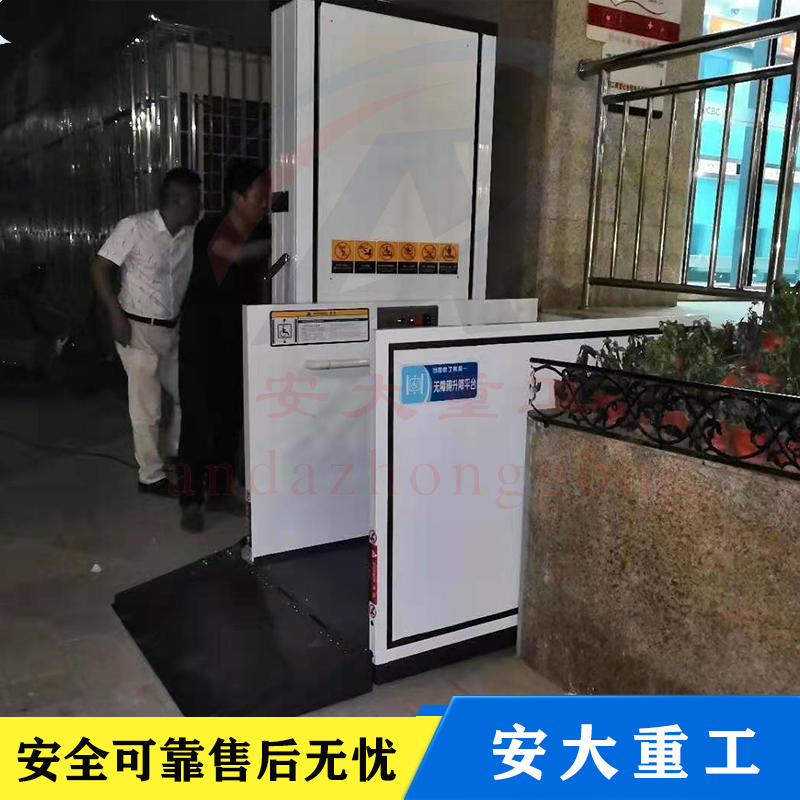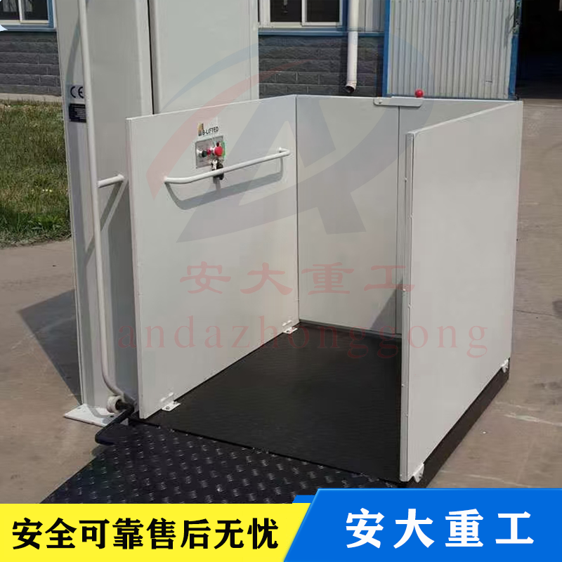 无障碍式升降平台,直接安装于地面,无需土建配套地坑,施工简单,产品放置户外不易积水,不易生锈,维护简便,升降高度1-6米。