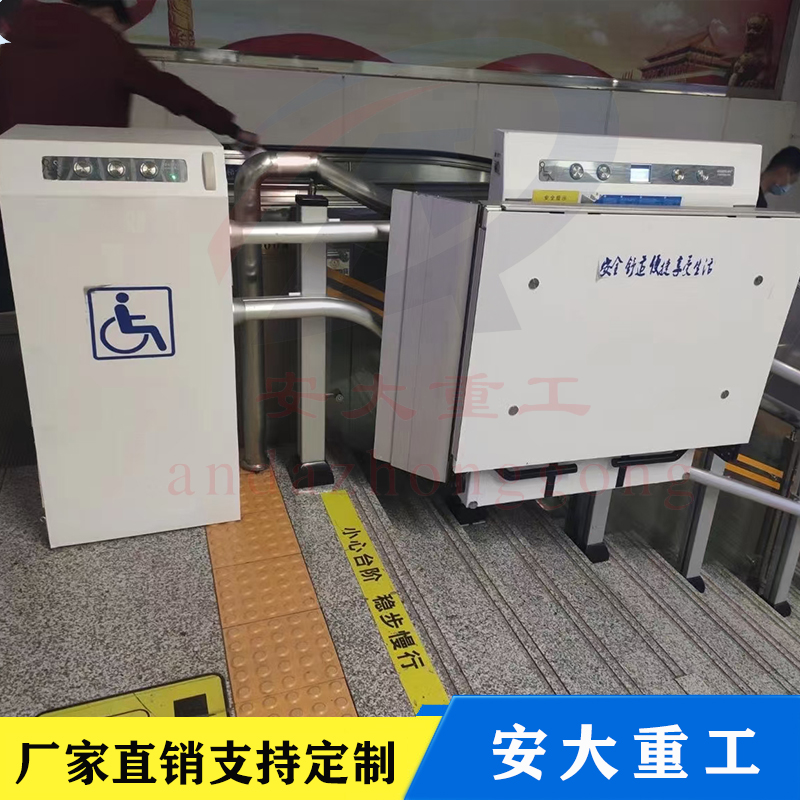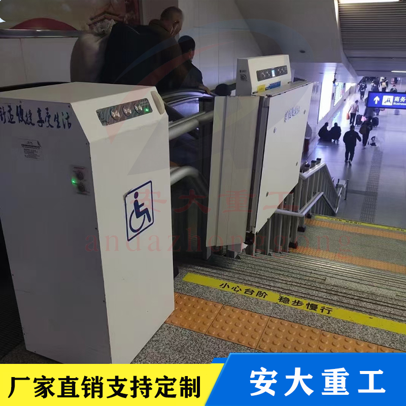 斜挎式无障碍升降平台按其运行方向分曲线型和直线型两种。直线型多采用齿轮齿条式驱动机构,沿楼梯做上升和下降,只能作直线运行不能转弯,倾斜角一般不大于35度,适用于楼层较低