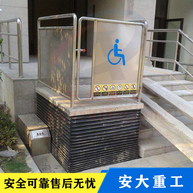 无障碍式升降平台,直接安装于地面,无需土建配套地坑,施工简单,产品放置户外不易积水,不易生锈,维护简便,升降高度1-6米。