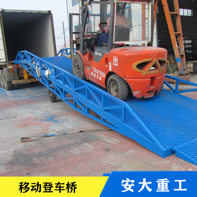 移动式登车桥式与叉车配合使用的货物装卸辅助设备,可根据汽车车厢的高低调节高度,叉车可以直接通过本设备驶入车厢内部机制进行货物的批量装卸,仅需单人作业即可实现货物的快速装卸