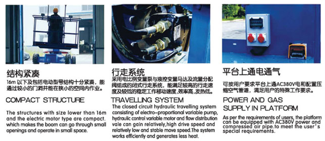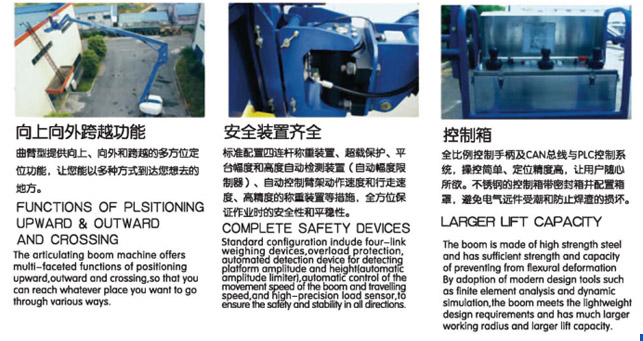 自行曲臂式高空作业平台动力分为柴油发动机型、直流马达型,升降臂有二节、三节、升降高度从10米至32米、所有机型全高度行走、曲臂延伸升降、转盘360旋转。不同机型配备不同的动力源,以适应室内室外的不同要求。使用柴油机或者蓄电池动力驱动,配合有效的几何设计和超长的跨越半径,使该款机型可以有效地避开棘手的障碍物作业。紧凑的工业设计底盘,优异的原地零尾摆旋转能力,因此低于20米的自行曲臂式升降作业平台能在有限的空间灵活操作。自行曲臂式升降作业平台是您维修、安装、修剪等高空作业的理想工具。